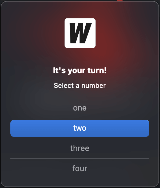 the second button is shown as default. When return is pressed, the value "two" is returned.